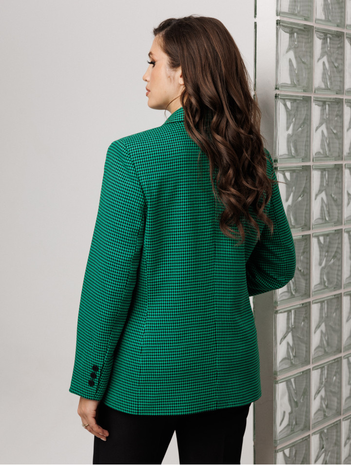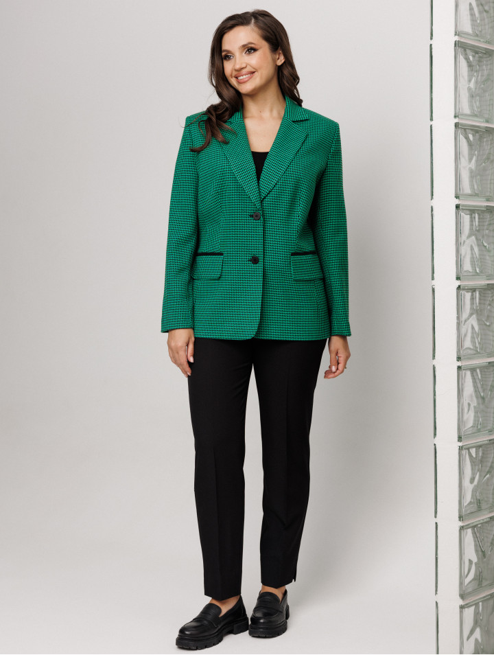 Жакет женский полуприлегающего силуэта, с втачным рукавом, воротник отложной с лацканами, по переду - карманы с клапанами, по низу рукава шлица с пуговицами, застёжка спереди на петли и пуговицы. Изделие на подкладке.
