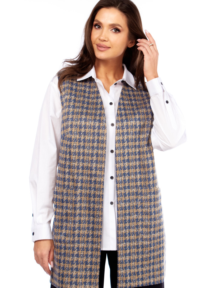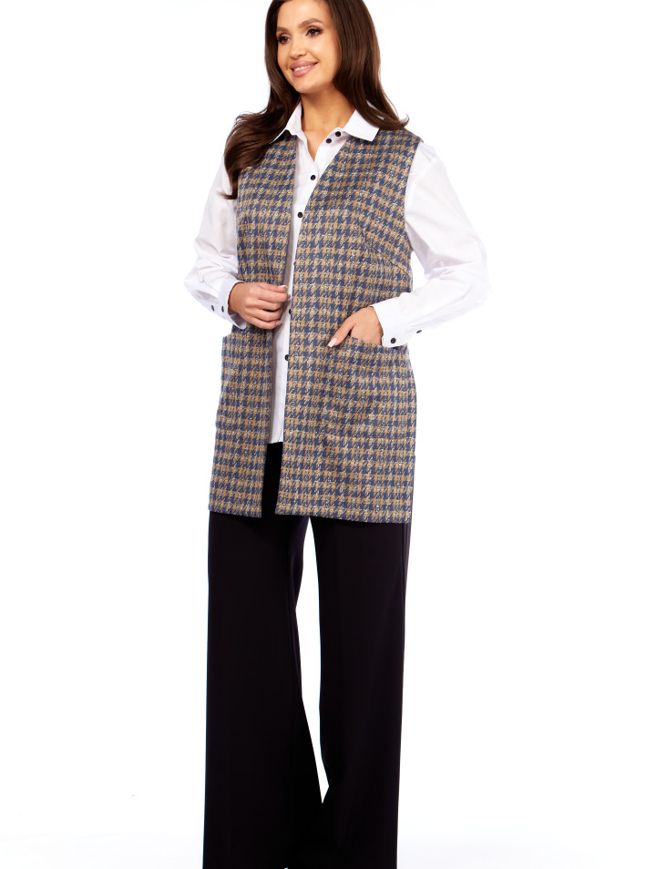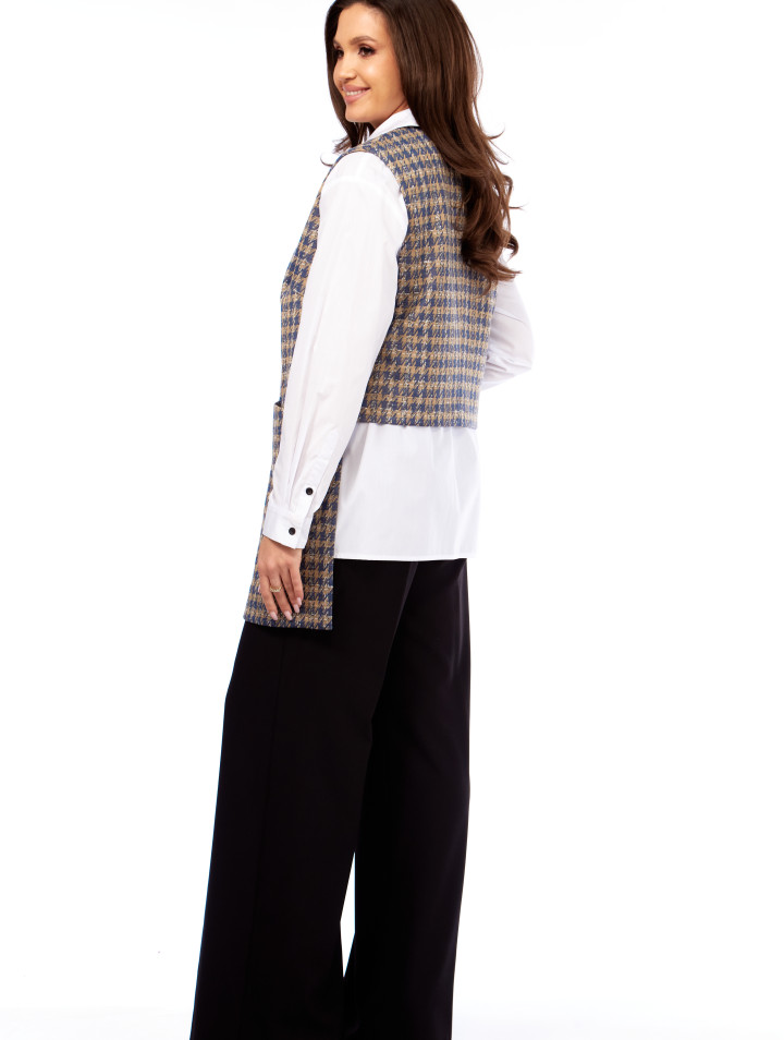 Комплект женский, состоит из жилета, блузки и брюк. Жилет прямого силуэта с v-образным вырезом горловины, без застежки, по переду накладные карманы, спинка значительно короче переда, разрезики по боковым швам. Блузка классическая, с рубашечным воротником на стойке, с втачным рубашечным рукавом с манжетой по низу, застежка спереди на планку с пуговицами, по боковым швам закругленные разрезы. Брюки прямые широкие, на поясе-кокетке, с застежкой спереди на молнию и пуговицы, с боковыми карманами со скосом по передним половинкам брюк.