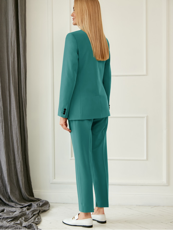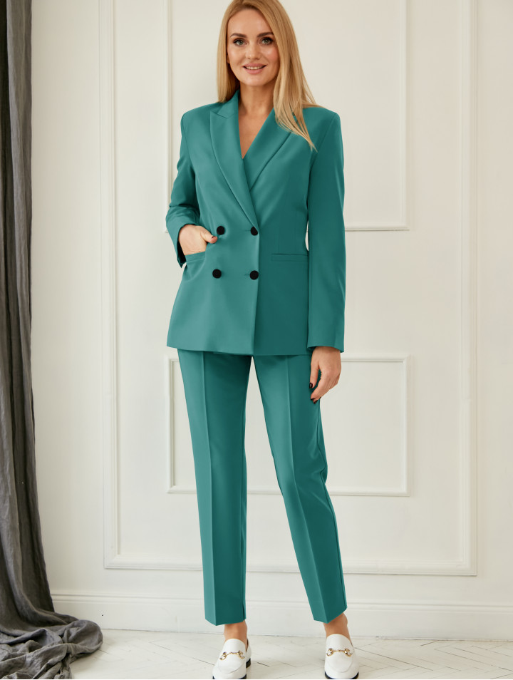 Костюм женский классический, состоит из жакета и брюк. Жакет полуприлегающего силуэта с втачным рукавом, по низу рукава шлица с пуговицами. Спереди два прорезных кармана. По спинке шлица, изделие на подкладке с дизайном (дизайн может меняться). Брюки-зауженные книзу 7/8 длины, с боковыми карманами, на поясе, спереди застегивается на молнию и пуговицы.
