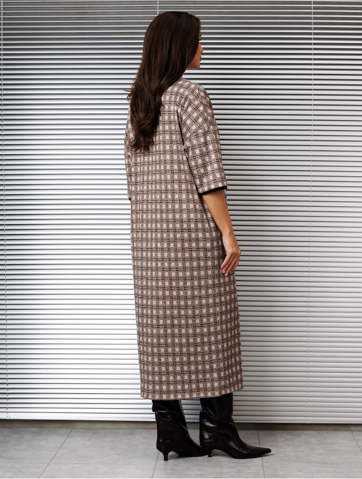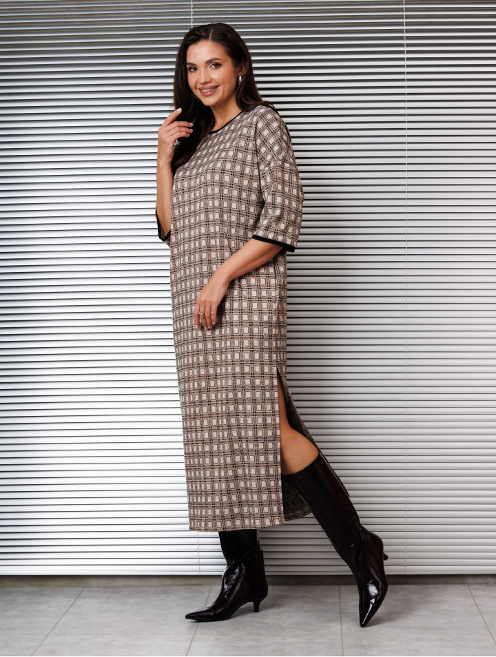 Платье женское трикотажное, свободное "оверсайз", со спущенной проймой и 3/4 рукавом и планкой по низу рукава,вырез горловины полукруглый с планкой, в боковых швах разрез и карманы.
